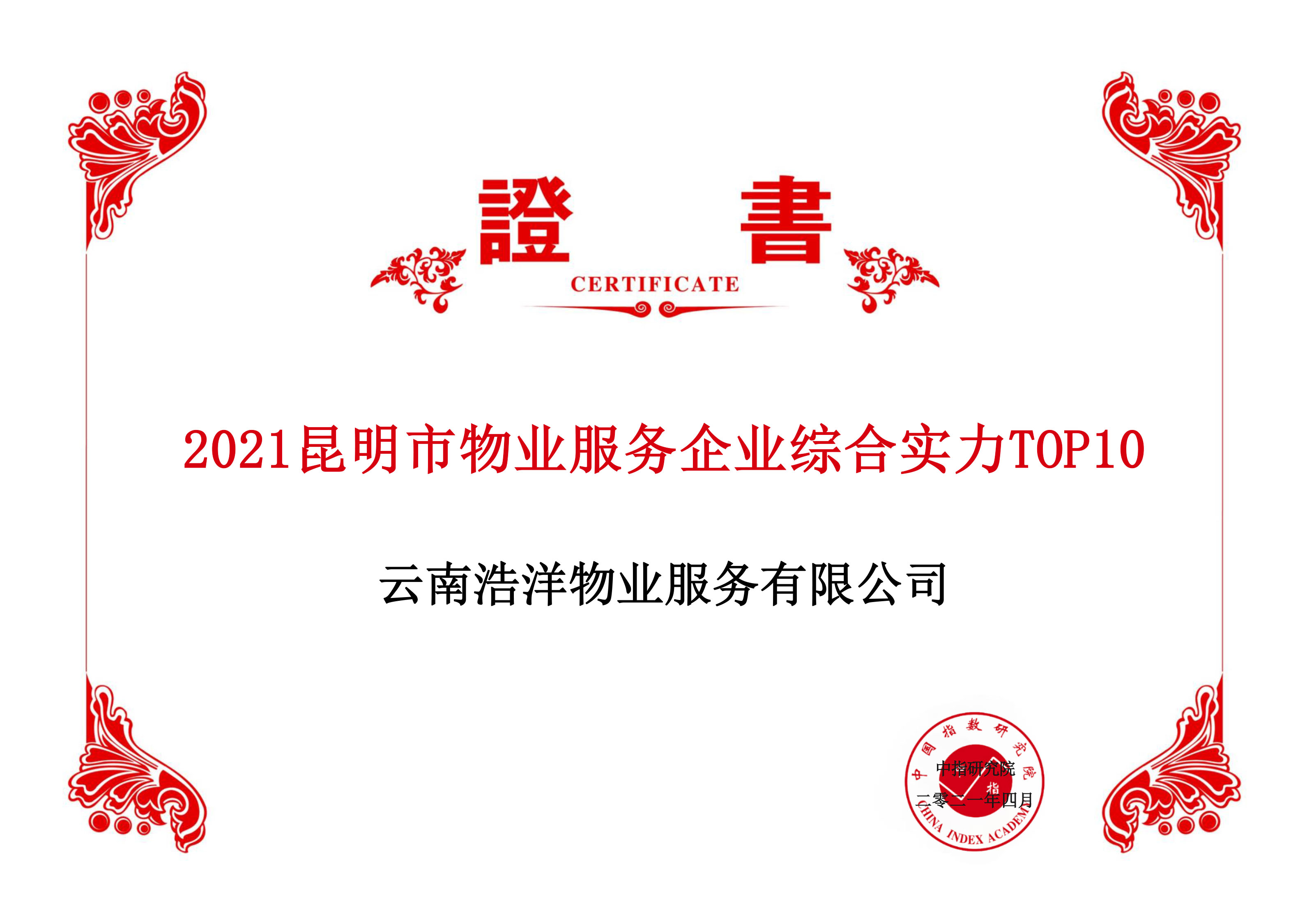 云南浩洋物業(yè)服務(wù)有限公司榮獲“2021昆明市物業(yè)服務(wù)企業(yè)綜合實力TOP 10”