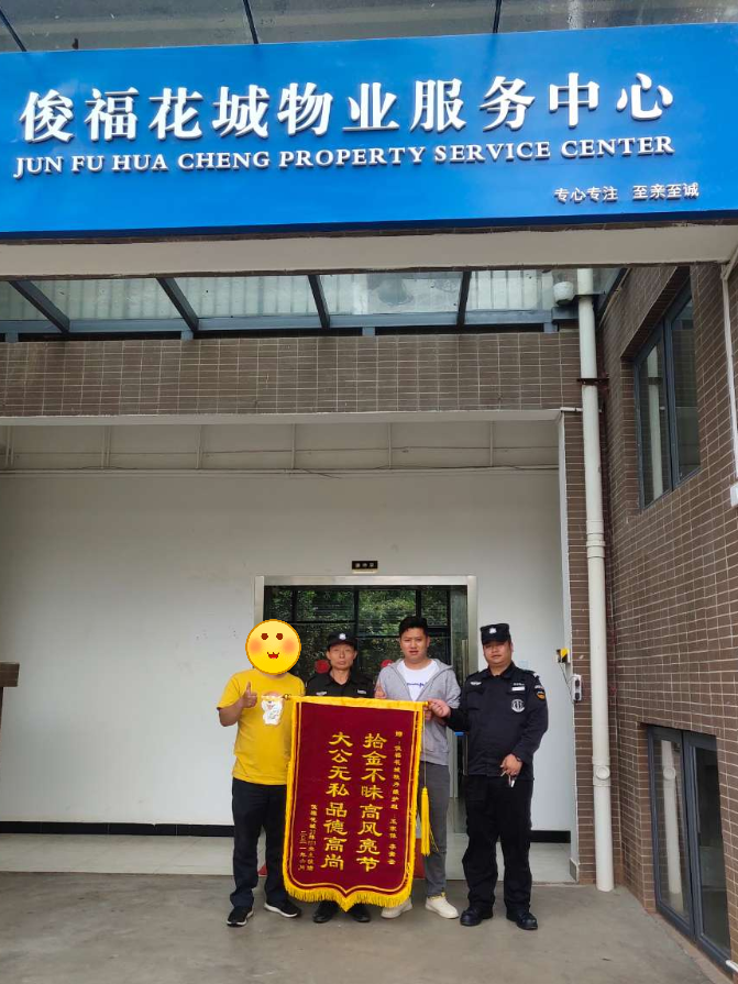 近日,我公司秩序員王家體在園區(qū)內(nèi)巡邏拾到手機(jī)一部,該員工撿到手機(jī)后主動(dòng)上報(bào)至班組主管。之后住戶至物業(yè)服務(wù)中心反映手機(jī)丟失,秩序主管極聯(lián)系班組員工,在確認(rèn)手機(jī)實(shí)為該住戶所有后將手機(jī)歸還住戶。住戶對(duì)李嵩云主管的工作效率給予很大的肯定,也對(duì)秩序員王家體同事拾金不昧的精神表示贊揚(yáng)。兩位員工的工作態(tài)度及效率得到住戶認(rèn)可,并為兩位同事送上錦旗。